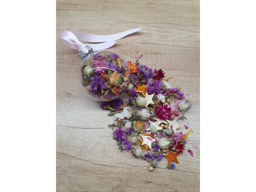 Něžná jako letní ráno, kdy se nebe zbarví do růžova. Skleněná koule (8cm) naplněná sušenými kvítky, tobolkami černuchy, makovičkami a okvětními plátky v jemných růžových tónech. Tichý dotek tepla, světla a klidu.